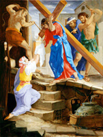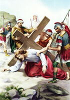 heavy cross on him. She sees the whole procession stopped by his first fall and